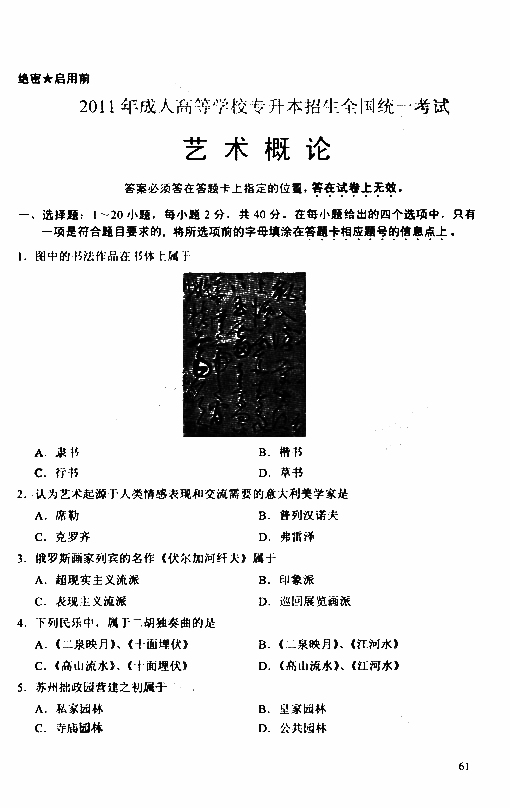 2011年成人高等学校招生全国统一考试专升本艺术概论试题及答案